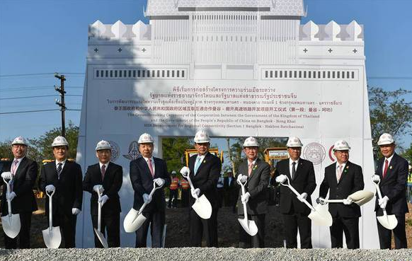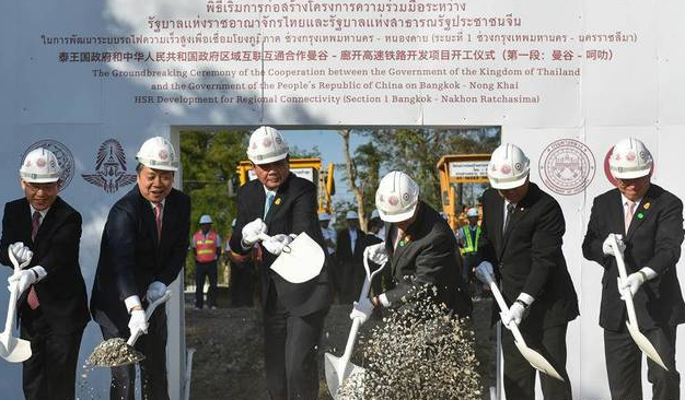 12月21日,泰國總理巴育(左三)與中泰鐵路合作聯(lián)委會中方主席、國家發(fā)改委副主任王曉濤(左二)等嘉賓們在泰國東北部呵叻府巴沖縣舉行的中泰鐵路合作項目一期工程開工儀式上共同鏟土。當日,中泰鐵路合作項目一期工程開工儀式在呵叻府巴沖縣舉行。李克強總理向開工儀式發(fā)來賀信。泰國總理巴育親臨現(xiàn)場致辭。中泰鐵路合作聯(lián)委會中方主席、國家發(fā)改委副主任王曉濤、中國駐泰國大使呂健,泰國交通部長阿空、內政部長阿努蓬,以及來自中泰政府部門、鐵路管理部門、相關企業(yè)、媒體等近400人出席開工儀式。新華社記者李芒茫攝