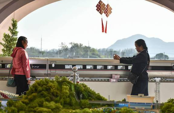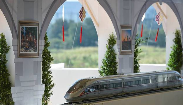 這是在泰國東北部呵叻府巴沖縣舉行的中泰鐵路合作項目一期工程開工儀式上展出的中國復興號高鐵列車模型(12月21日攝)。